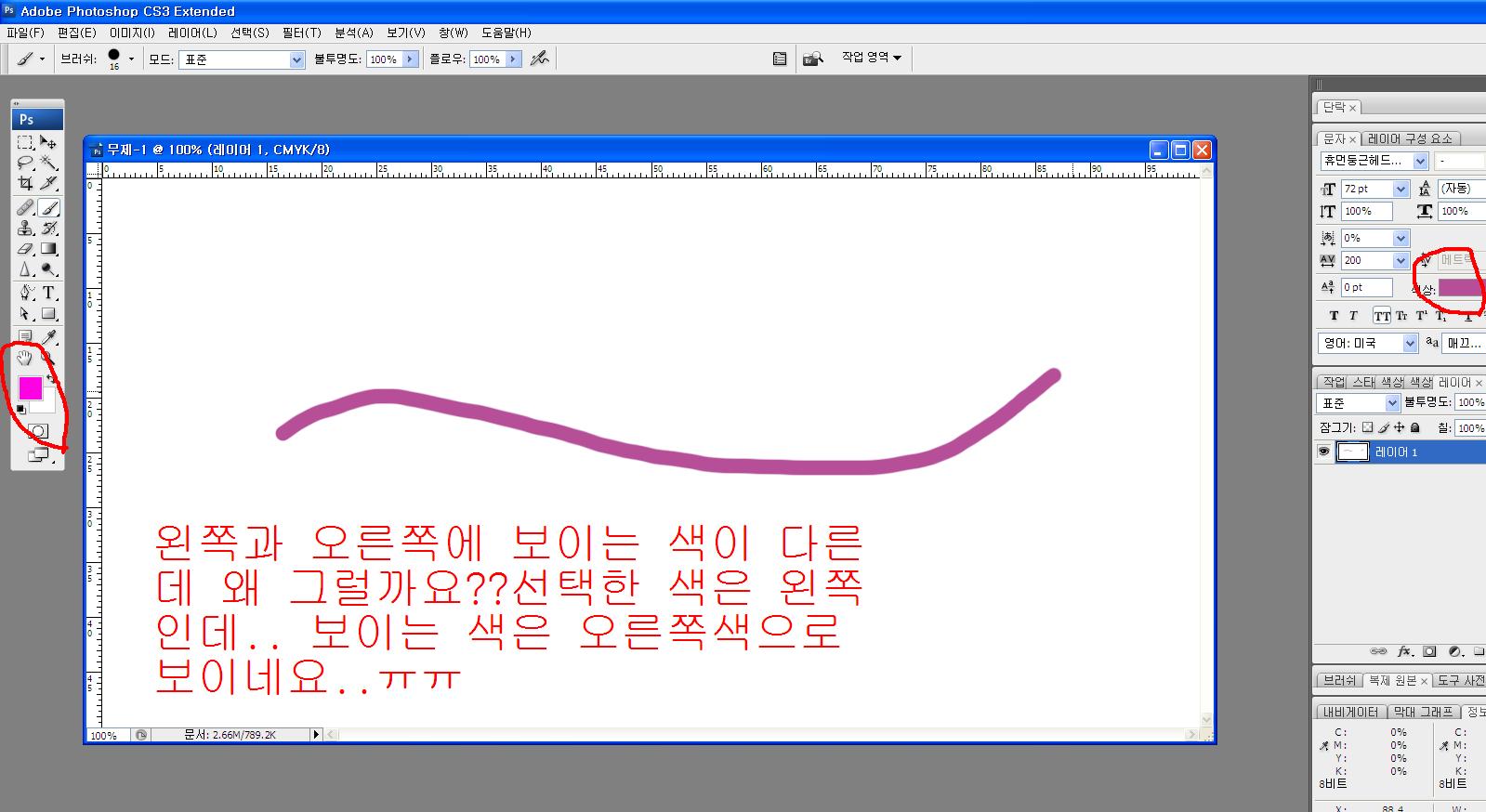 emoticon_096 혹시 단순. 모니터 자체의 좌측과 우측의 색상표현에서 차이가 있는것 아닌지 팔레트를 같은쪽으로 옮겨보세요. 그렇지 않으면...작업하는 도큐멘트 색상모드를 현재 CMYK에서 RGB모드로 바꾸어 보세요. ========= ▷▶☎ 잘 해결이 안되신다면.. 준[A/S 판매]를 클릭후 <자기 소개>를 마우스로 눌러보세요.